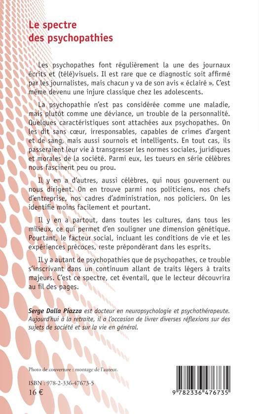 Les psychopathes font régulièrement la une des journaux écrits et (télé)visuels. Il est rare que ce diagnostic soit affirmé par les journalistes, mais chacun y va de son avis « éclairé ». C’est même devenu une injure classique chez les adolescents. La psychopathie n’est pas considérée comme une maladie, mais plutôt comme une déviance, un trouble de la personnalité. Quelques caractéristiques sont attachées aux psychopathes. On les dit sans cœur, irresponsables, capables de crimes d’argent et de sang, mais aussi sournois et intelligents. En tout cas, ils passeraient leur vie à transgresser les normes sociales, juridiques et morales de la société. Parmi eux, les tueurs en série célèbres nous fascinent peu ou prou. Il y en a d’autres, aussi célèbres, qui nous gouvernent ou nous dirigent. On en trouve parmi nos politiciens, nos chefs d’entreprise, nos cadres d’administration, nos policiers. On les identifie moins facilement et pourtant. Il y en a partout, dans toutes les cultures, dans tous les milieux, ce qui permet d’en souligner une dimension génétique. Pourtant, le facteur social, incluant les conditions de vie et les expériences précoces, reste prépondérant dans les esprits. Il y a autant de psychopathies que de psychopathes, ce trouble s’inscrivant dans un continuum allant de traits légers à traits majeurs. C’est ce spectre, cet éventail, que le lecteur découvrira au fil des pages.