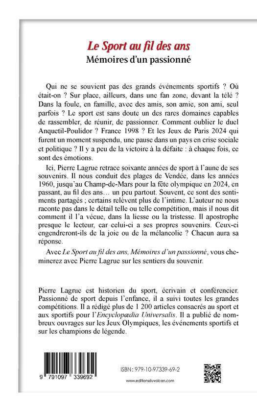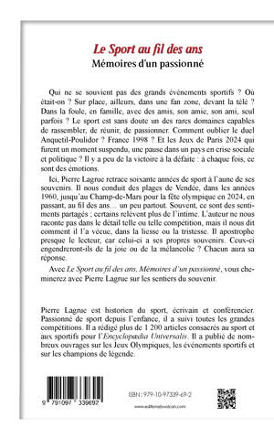 Le sport, c’est de la passion, de l’émotion. Au-delà des compétitions, plongez dans vos souvenirs, du Tour de France des années 1960 aux Jeux Olympiques 2024. Points forts : Mémoires d’un historien du sport 60 ans de souvenirs et d’émotions à partager Des récits sur de nombreuses disciplines sportives Retours sur les grands événements et exploits sportifs Des champions et championnes professionnels et amateurs Les Jeux Olympiques et Paralympiques Présentation: Qui ne se souvient pas des grands événements sportifs ? Où était-on ? Sur place, ailleurs, dans une fan zone, devant la télé ou près d’un transistor ? Dans la foule, en famille, avec des amis, son amie, son ami, seul parfois ? Le sport est sans doute un des rares domaines capables de rassembler, de réunir, de passionner. Comment oublier le duel Anquetil-Poulidor des années 1960 ? France 1998, la France « Black, Blanc, Beur », certes factice ? Et les Jeux de Paris 2024 qui furent un moment suspendu, une pause dans un pays en crise sociale et politique ? Ici, Pierre Lagrue retrace soixante années de sport à l’aune de ses souvenirs. Beaucoup sont des moments partagés, certains relèvent plus de l’intime. Il nous conduit des plages de Vendée, dans les années 1960, jusqu’au Champ-de-Mars pour la fête olympique en 2024, en passant, au fil des ans... un peu partout. Il ne nous raconte pas dans le détail telle ou telle compétition, mais il nous dit comment il l’a vécue, dans la liesse – l’envie soudaine d’embrasser un inconnu – ou la tristesse – des silences assourdissants dans la ville. Les grands marqueurs du sport français – la nuit de Séville en 1982, l’Euro 2000, la Coupe du monde 2018, les Grands Chelems du rugby, les victoires olympiques, le Tour de France – sont tous bien présents. Ne sont pas oubliés les événements internationaux – l’auteur était parfois sur place, souvent devant la télé ou près d’un poste de radio. À chaque fois, il livre ses impressions. Il apostrophe presque le lecteur, car celui-ci a ses propres souvenirs. Le déroulé d’un match sera a priori identique pour chacun. En revanche, le ressenti n’est jamais le même. L’émotion, c’est personnel ; le souvenir peut se moduler avec le temps ; il peut engendrer de la joie comme de la mélancolie. Le lecteur pourra voir ressurgir ce souvenir en parcourant les pages de l’ouvrage. Pierre Lagrue nous parle de ses brèves rencontres avec Muhammad Ali ou Katarina Witt, Bernard Thévenet, Colette Besson ou Guy Roux. Il vous invite à croiser virtuellement de multiples champions et championnes, dans les grands stades comme dans les petites salles. Vous cheminerez avec lui sur les sentiers des souvenirs sportifs.