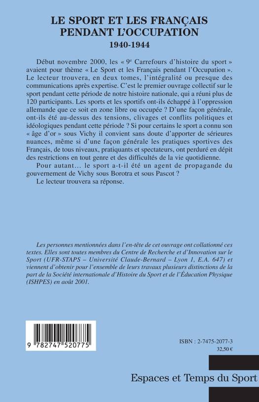 C'est le premier ouvrage collectif sur le sport pendant cette période de notre histoire nationale. Les sports et les sportifs ont-ils échappé à l'oppression allemande que ce soit en zone libre ou occupée ? D'une façon générale, ont-ils été au-dessus des tensions, clivages et conflits politiques et idéologiques pendant cette période ? Le sport a-t-il été un agent de propagande du gouvernement de Vichy sous Borotra et sous Pascot ?