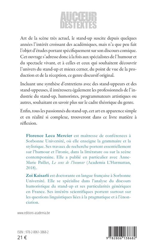 Art de la scène très actuel, le stand-up suscite depuis quelques années l'intérêt croissant des académiques, mais n'a que peu fait l'objet d'études portant spécifiquement sur son discours comique. Cet ouvrage s'adresse donc à la fois aux spécialistes de l'humour et du spectacle vivant, et à celles et ceux qui souhaitent découvrir l'univers du stand-up et mieux cerner, du point de vue de la production et de la réception, ce genre discursif original. Incluant une synthèse d'entretiens avec des stand-uppeurs et des stand-uppeuses, il intéressera également les professionnels de l'industrie du stand-up, humoristes, programmateurs artistiques ou autres, souhaitant en savoir plus sur le cadre théorique du genre. Enfin, tous les passionnés du stand-up, cet art en apparence simple et en réalité si complexe, trouveront dans ce livre matière à réflexion.