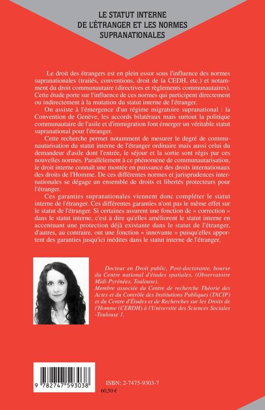 Le droit des étrangers est en plein essor sous l'influence des normes supranationales (traités, conventions, droit de la CEDH, etc.) et notamment du droit communautaire (directives et règlements communautaires). Cette étude porte sur l'influence de ces normes qui participent directement ou indirectement à la mutation du statut interne de l'étranger. On assiste à l'émergence d'un régime migratoire supranational : la Convention de Genève, les accords bilatéraux mais surtout la politique communautaire de l'asile et d'immigration.