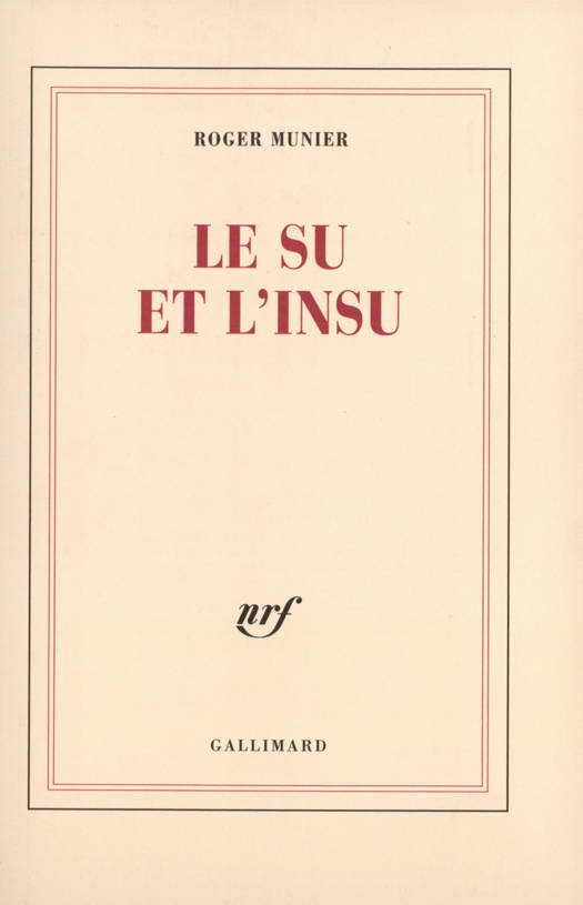 "Le su est ce qu'on sait ou croit savoir. L'insu est ce qui nous échappe, hors du su, mais aussi bien en lui. Le su qui nous entoure est notre appui dans l'incertain. Mais il n'est que de surface. Seul l'insu touche à la profondeur. C'est lui que j'interroge au long des jours, en tentant de relever ses traces dans le quotidien le plus banal ou dans ces instants soudains qui ébranlent notre présence au monde. Retrouver cet insu enfoui, le déchiffrer dans le su lui-même, hors du rassurant savoir, me semble être la première, sinon la plus sûre tâche de la littérature." Roger Munier.
