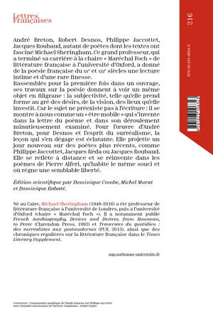 André Breton, Robert Desnos, Philippe Jaccottet, Jacques Roubaud, autant de poètes dont les textes ont fasciné Michael Sheringham. Ce grand professeur, qui a terminé sa carrière à la chaire « Maréchal Foch » de littérature française à l’université d’Oxford, a donné de la poésie française du XXe et du XXIe siècles une lecture intime et d’une rare finesse.