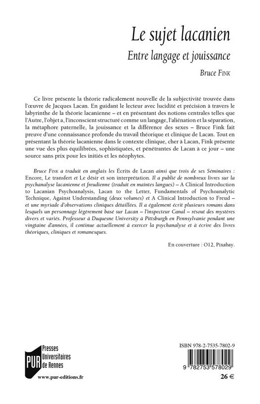 Ce livre présente la théorie radicalement nouvelle de la subjectivité trouvée dans l'oeuvre de Jacques Lacan. En guidant le lecteur avec lucidité et précision à travers le labyrinthe de la théorie lacanienne - et en présentant des notions centrales telles que l'Autre, l'objet a, l'inconscient structuré comme un langage, l'aliénation et la séparation, la métaphore paternelle, la jouissance et la différence des sexes - Bruce Fink fait preuve d'une connaissance profonde du travail théorique et clinique de Lacan. Tout en présentant la théorie lacanienne dans le contexte clinique, Fink présente une vue des plus équilibrées, sophistiquées et pénétrantes de Lacan à ce jour - une source sans prix pour les initiés et les néophytes.