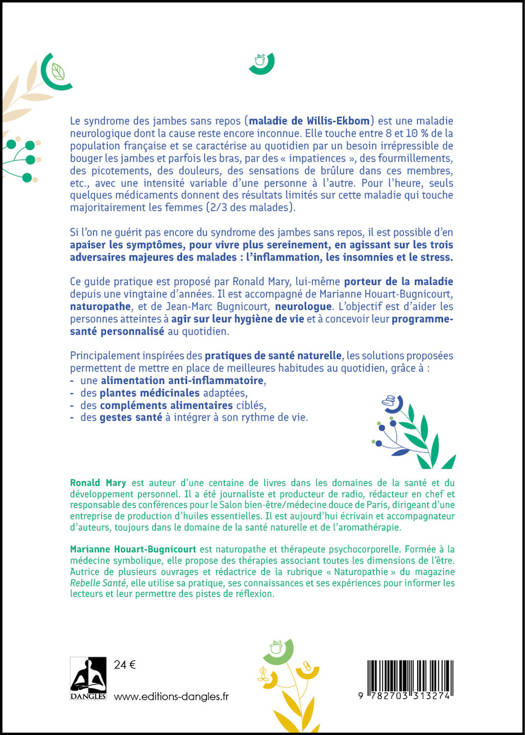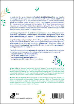 Le syndrome des jambes sans repos (maladie de Willis Ekbom) est une maladie neurologique dont la cause reste encore inconnue. Elle touche entre 8 et 10 % de la population française et se caractérise au quotidien par un besoin irrépressible de bouger les jambes et parfois les bras, par des « impatiences », des fourmillements, des picotements, des douleurs, des sensations de brûlure dans ces membres, etc., avec une intensité variable d’une personne à l’autre. Pour l’heure, seuls quelques médicaments donnent des résultats limités sur cette maladie qui touche majoritairement les femmes (2/3 des malades). Si l’on ne guérit pas encore du syndrome des jambes sans repos, il est possible d’en apaiser les symptômes, pour vivre plus sereinement, en agissant sur les trois adversaires majeures des malades : l’inflammation, les insomnies et le stress. Ce guide pratique est proposé par Ronald Mary, lui-même porteur de la maladie depuis une vingtaine d’années. Il est accompagné de Marianne Houart-Bugnicourt, naturopathe, et de Jean-Marc Bugnicourt, neurologue. L’objectif est d’aider les personnes atteintes à agir sur leur hygiène de vie et à concevoir leur programme-santé personnalisé au quotidien. Principalement inspirées des pratiques de santé naturelle, les solutions proposées permettent de mettre en place de meilleures habitudes au quotidien, grâce à : une alimentation anti-inflammatoire, des plantes médicinales adaptées, des compléments alimentaires ciblés, des gestes santé à intégrer à son rythme de vie.