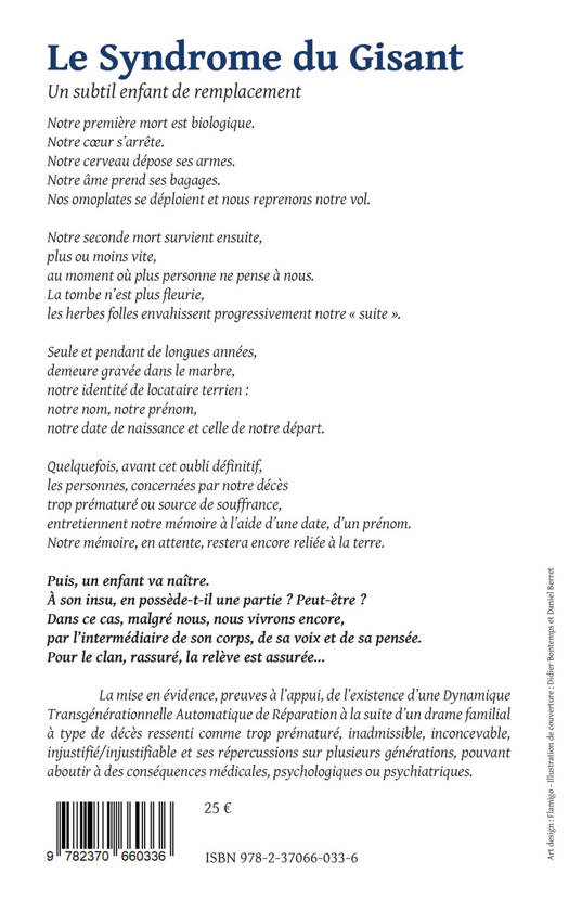 Notre première mort est biologique. Notre cœur s’arrête. Notre cerveau dépose ses armes. Notre âme prend ses bagages. Nos omoplates se déploient et nous reprenons notre vol. Notre seconde mort survient ensuite, plus ou moins vite, au moment où plus personne ne pense à nous. La tombe n’est plus fleurie, les herbes folles envahissent progressivement notre « suite ». Seule et pendant de longues années, demeure gravée dans le marbre, notre identité de locataire terrien : notre nom, notre prénom, notre date de naissance et celle de notre départ. Quelquefois, avant cet oubli définitif, les personnes, concernées par notre décès trop prématuré ou source de souffrance, entretiennent notre mémoire à l’aide d’une date, d’un prénom. Notre mémoire, en attente, restera encore reliée à la terre. Puis, un enfant va naître. A son insu, en possède-t-il une partie ? Peut-être ? Dans ce cas, malgré nous, nous vivrons encore, par l’intermédiaire de son corps, de sa voix et de sa pensée. Pour le clan, rassuré, la relève est assurée... La mise en évidence, preuves à l’appui, de l’existence d’une dynamique transgénérationnelle automatique de réparation à la suite d’un drame familial à type de décès ressenti comme trop prématuré, inadmissible, inconcevable, injustifié/injustifiable et ses répercussions sur plusieurs générations, pouvant aboutir à des conséquences médicales, psychologiques ou psychiatriques.