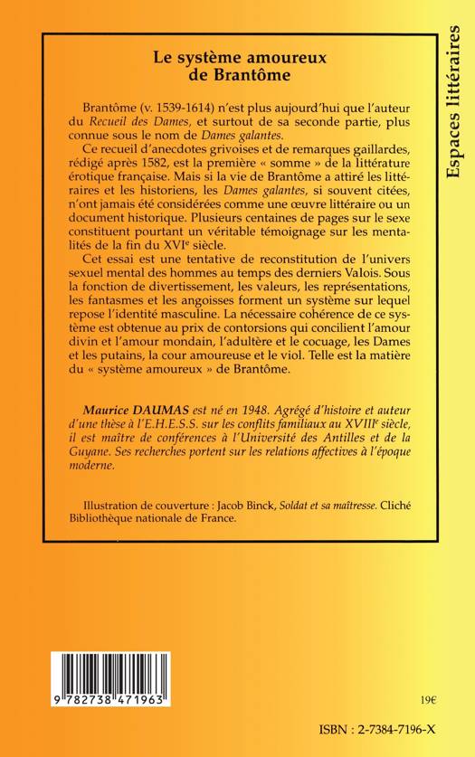 Brantôme (v. 1539-1614) n'est plus aujourd'hui que l'auteur du Recueil des Dames, et surtout de sa seconde partie, plus connue sous le nom de Dames galantes. Ce recueil d'anecdotes grivoises et de remarques gaillardes, rédigé après 1582, est la première " somme " de la littérature érotique française. Mais si la vie de Brantôme a attiré les littéraires et les historiens, les Dames galantes, si souvent citées, n'ont jamais été considérées comme une œuvre littéraire ou un document historique. Cet essai est une tentative de reconstitution de l'univers sexuel mental des hommes au temps des derniers Valois.