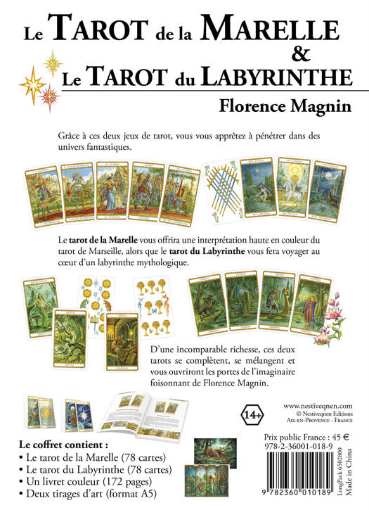 Florence Magnin nous dévoile une part de son imaginaire et nous offre non pas un, mais deux tarots d'exception ! Sa maîtrise de la symbolique du tarot de Marseille, associés à son style pictural extraordinaire, lui ont permis de développer le tarot de la Marelle. La richesse de son imagination et sa connaissance de la mythologie l'ont aidé à façonner le tarot du Labyrinthe. Chaque arcane recèle ses propres secrets et nous ouvre une fenêtre sur l'univers onirique et minutieux de Florence Magnin. Assemblées et combinées, les cartes forment deux dédales, deux parcours initiatiques qui ne demandent qu'à être révélés- Ce coffret prestigieux contient deux tarots de 78 cartes chacun, un livret explicatif de 120 pages et deux tirages d'art inédits.
