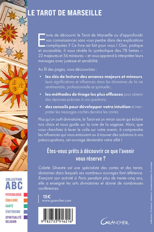 Envie de découvrir le Tarot de Marseille ou d’approfondir vos connaissances sans vous perdre dans des explications compliquées ? Ce livre est fait pour vous ! Clair, pratique et accessible, il vous révèle la symbolique des 78 lames – 22 majeures et 56 mineures – et vous apprend à interpréter leurs messages avec justesse et sensibilité. Au fil des pages, vous découvrirez : les clés de lecture des arcanes majeurs et mineurs, leurs significations et influences dans les domaines de la vie sentimentale, professionnelle et spirituelle ; les méthodes de tirage les plus efficaces pour obtenir des réponses précises à vos questions ainsi que des conseils pour développer votre intuition et interpréter les messages cachés derrière les cartes. Plus qu’un outil divinatoire, le Tarot est un miroir sacré qui éclaire nos choix et nous guide sur la voie de la sagesse. Alors, que vous cherchiez à lever le voile sur votre avenir, à comprendre les influences qui vous entourent ou à trouver des solutions à vos préoccupations, cet ouvrage deviendra votre allié ! Êtes-vous prêts à découvrir ce que l’avenir vous réserve ?