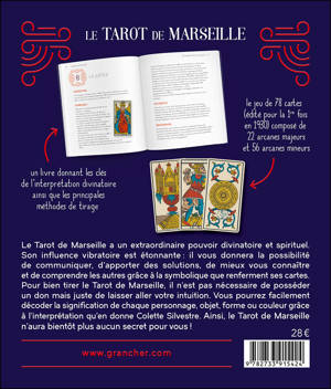 Le Tarot de Marseille a un extraordinaire pouvoir divinatoire et spirituel. Son influence vibratoire est étonnante : il vous donnera la possibilité de communiquer, d’apporter des solutions, de mieux vous connaître et de comprendre les autres grâce à la symbolique que renferment ses cartes. Pour bien tirer le Tarot de Marseille, il n’est pas nécessaire de posséder un don mais juste de laisser aller votre intuition. Vous pourrez facilement décoder la signification de chaque personnage, objet, forme ou couleur grâce à l’interprétation qu’en donne Colette Silvestre. Ainsi, le Tarot de Marseille n’aura bientôt plus aucun secret pour vous ! Coffret contenant le jeu de 78 cartes édité par Grimaud en 1930.