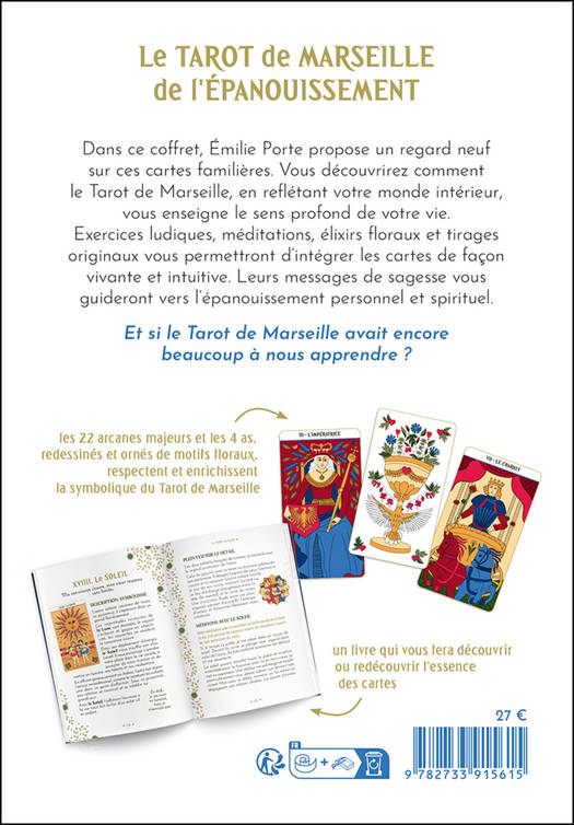 Dans ce coffret, Émilie Porte propose un regard neuf sur ces cartes familières. Vous découvrirez comment le Tarot de Marseille, en reflétant votre monde intérieur, vous enseigne le sens profond de votre vie. Exercices ludiques, méditations, élixirs floraux et tirages originaux vous permettront d’intégrer les cartes de façon vivante et intuitive. Leurs messages de sagesse vous guideront vers l’épanouissement personnel et spirituel. Et si le Tarot de Marseille avait encore beaucoup à nous apprendre ?