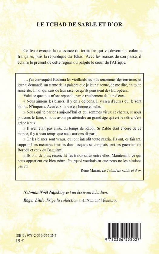 … j’ai convoqué à Koumra les vieillards les plus renommés des environs, et leur ai demandé, au terme de la palabre que je leur ai tenue, de me dire, en toute sincérité, à moi qui suis de leur race, ce qu’ils pensaient des Européens. Voici ce que tous m’ont répondu, par le truchement de l’un d’eux. « Nous aimons les blancs. Il y en a de bons. Il y en a d’autres qui le sont moins. N’importe. Avec eux, la vie est bonne et belle. » Nous qui te parlons aujourd’hui et qui sommes vieux et chenus, si nous pouvons le faire, si nous avons pu atteindre au grand âge qui est le nôtre, c’est grâce à eux. » Il n’en était pas ainsi, du temps de Rabbi. Si Rabbi était encore de ce monde, il y a beau temps que nous aurions disparu. » Or les blancs sont venus, qui ont interdit toute razzia. Ils ont, ce faisant, supprimé les meurtres inutiles dans lesquels se complaisaient les guerriers du Bornou et ceux du Baguirmi. » Ils ont, de plus, réconcilié les tribus saras entre elles. Maintenant, ce qui nous appartient est bien nôtre. Pourquoi voudrais-tu que nous ne les aimions pas ? » René Maran, Le Tchad de sable et d’or