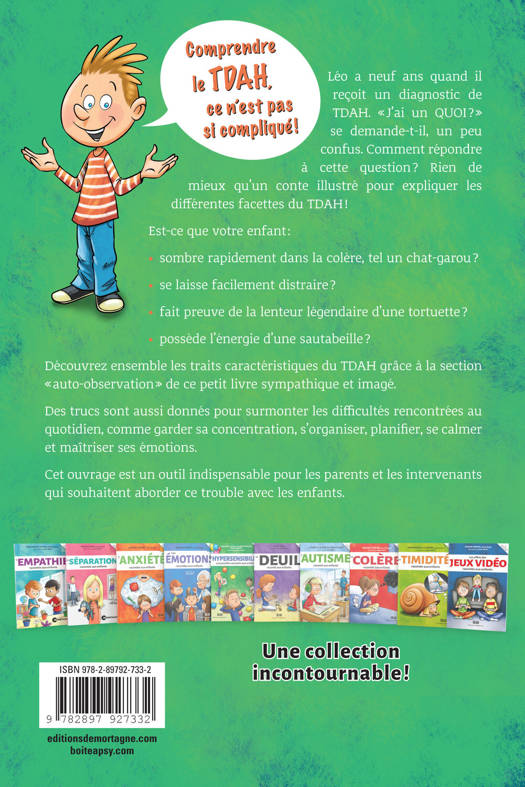 Léo a neuf ans quand il reçoit un diagnostic de TDAH. « J’ai un QUOI? » se demande-t-il, un peu confus. Comment répondre à cette question ? Rien de mieux qu'un conte illustré pour expliquer les différentes facettes du TDAH ! Est-ce que votre enfant : sombre rapidement dans la colère, tel un chat-garou ? ; se laisse facilement distraire ? ; fait preuve de la lenteur légendaire d'une tortuette ? ; possède l'énergie d'une sautabeille ? Découvrez ensemble les traits caractéristiques du TDAH grâce à la section « auto-observation » de ce petit livre sympathique et imagé. Des trucs sont aussi donnés pour surmonter les difficultés rencontrées au quotidien, comme garder sa concentration, s'organiser, planifier, se calmer et maîtriser ses émotions. Cet ouvrage est un outil indispensable pour les parents et les intervenants qui souhaitent aborder ce trouble avec les enfants.