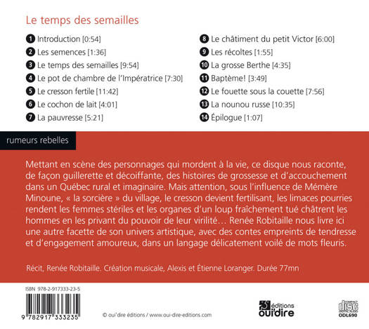 Mettant en scène des personnages qui mordent à la vie, ce disque nous raconte, de façon guillerette et décoiffante, des histoires de grossesse et d'accouchement dans un Québec rural et imaginaire. Mais attention, sous l'influence de Mémère Minoune, « la sorcière » du village, le cresson devient fertilisant, les limaces pourries rendent les femmes stériles et les organes d'un loup fraîchement tué châtrent les hommes en les privant du pouvoir de leur virilitéâ€- Renée Robitaille nous livre ici une autre facette de son univers artistique, avec des contes empreints de tendresse et d'engagement amoureux, dans un langage délicatement voilé de mots fleuris.