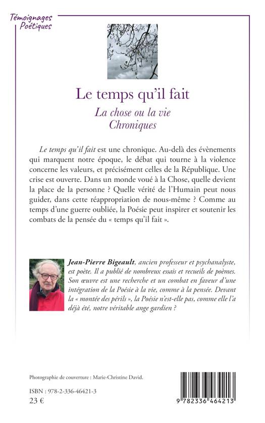 « Le temps qu’il fait » est une chronique. Au-delà des évènements qui marquent notre époque, le débat qui tourne à la violence concerne les valeurs, et précisément celles de la République. Une crise est ouverte. Dans un monde voué à la Chose, quelle devient la place de la personne ? Quelle vérité de l’Humain peut nous guider, dans cette réappropriation de nous-même ? Comme au temps d’une guerre oubliée, la Poésie peut inspirer et soutenir les combats de la pensée du « temps qu’il fait ».