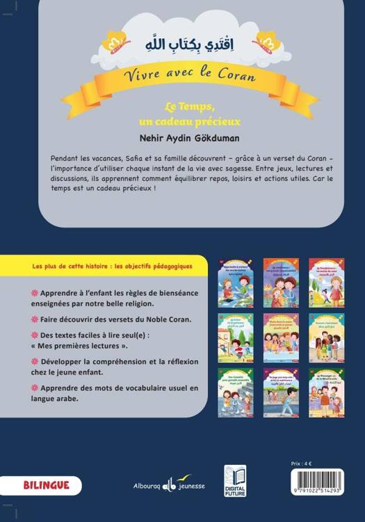 Immergezvous dans l’univers chaleureux et lumineux de Safia et de sa famille où chaque jour est l’occasion d’apprendre et de grandir À travers les petits gestes quotidiens cette série de 10 livres bilingues guide les enfants vers une compréhension douce et inspirante de valeurs essentielles comme le respect la générosité et l’amour familial le tout éclairé par la sagesse des versets coraniques 7 Le Temps un cadeau précieuxPendant les vacances Safia et sa famille découvrent grâce à un verset du Coran l'importance d’utiliser chaque instant de la vie avec sagesse Entre jeux lectures et discussions ils apprennent comment équilibrer repos loisirs et actions utiles Car le temps est un cadeau précieux Autres épisodes 1 Apprendre à s’aimer les uns les autres2 La Confiance une grande responsabilité 3 La Bienfaisance les mains du cœur 4 Le Trésor de la Patience5 Main dans la main Fraternité et amour6 Donner c'est aimer 8 Des Conseils pour grandir ensemble9 Ne juge pas trop vite Évite la médisance10 Le Messager ﷺ de la Miséricorde