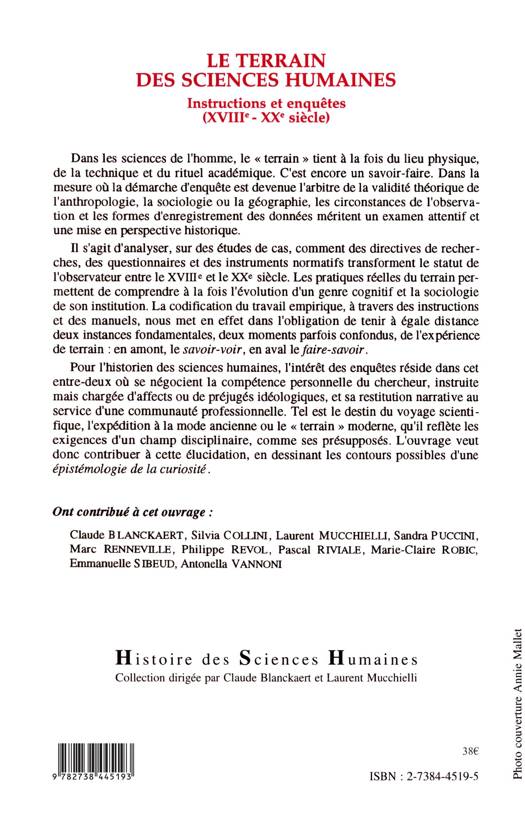 Dans les sciences de l'homme, le « terrain » tient à la fois du lieu physique, de la technique et du rituel académique. C'est encore un savoir-faire. Dans la mesure où la démarche d'enquête est devenue l'arbitre de la validité théorique de l'anthropologie, la sociologie ou la géographie, les circonstances de l'observation et les formes d'enregistrement des données méritent un examen attentif et une mise en perspective historique.