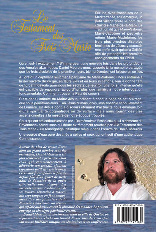 Quelque part sur les rives françaises de la Méditerranée, un petit village porte le nom des Saintes-Marie-de-la-Mer. La Tradition dit que Marie-Salomé, Marie-Jacobée et peut-être même Marie-Madeleine, les trois plus proches disciples féminines de Jésus, y accostèrent après avoir quitté la Galilée afin de propager les premiers enseignements du Christ. Qu'en est-il exactement ? S'immergeant une nouvelle fois dans les profondeurs des Annales akashiques, Daniel Meurois nous rapporte ici la mémoire partagée que les trois disciples de la première heure, bien présentes, ont laissée en ce lieu. Au gré d'un captivant récit mené par l'âme de Marie-Salomé, il nous entraîne à la découverte de ce qui, en leurs vies et en leurs initiations, leur a donné tant de force. Il dévoile pour nous les secrets de leur foi, une foi si intense qu'elle est capable de répondre, aujourd'hui plus que jamais, à notre interrogation fondamentale : Comment trouver la Paix et le Sacré en soi ? C'est dans l'intimité du Maître Jésus, présent à chaque page, que nous pénétrons alors… un Jésus humain, divin, insaisissable et bouleversant de Lumière. Un Jésus dont le discours étonnant d'actualité nous emmène loin d'une spiritualité dogmatique ou de surface mais nous fournit des clés ascensionnelles à la mesure de notre époque troublée. Ceux qui ont été enthousiasmés par ''De mémoire d'Essénien'' ou ''La Demeure du Rayonnant'' seront sans nul doute extrêmement touchés par ''Le Testament des Trois Marie'', un témoignage initiatique majeur dans l'œuvre de Daniel Meurois.