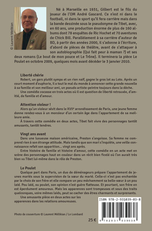 Liberté chérie : une comédie cocasse en trois actes où il est question de liberté retrouvée, d’amitié, de famille et d’amour. Attention violeur ! : une comédie en deux actes où Tibet fait vivre des personnages tantôt amusants, tantôt tendres : un policier homo, un petit monsieur encore sous l’emprise de sa maman, un jeune boucher désordonné, une jeune femme dynamique et une autre réservée. Vingt ans avant : entre histoire de famille et histoire d’amour, cette comédie en un acte met en scène des personnages hauts en couleur dans un récit bien ficelé où l’on aurait très bien vu Tibet lui-même dans le rôle de Preston. Le poulet : une divertissante comédie en deux actes sur l’amour et les apparences.