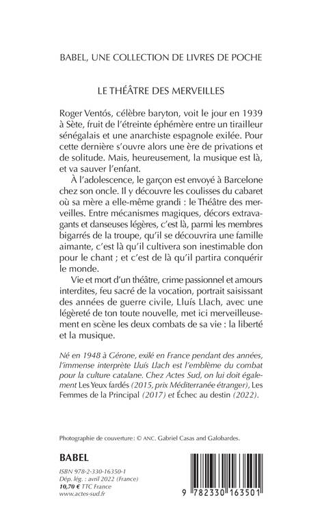 Roger Ventós, célèbre baryton, voit le jour en 1939 à Sète, fruit de l'étreinte éphémère entre un tirailleur sénégalais et une anarchiste espagnole exilée. Pour cette dernière s'ouvre alors une ère de privations et de solitude. Mais, heureusement, la musique est là, et va sauver l'enfant. À l'adolescence, le garçon est envoyé à Barcelone chez son oncle. Il y découvre les coulisses du cabaret où sa mère a elle-même grandi : le Théâtre des merveilles. Entre mécanismes magiques, décors extravagants et danseuses légères, c'est là, parmi les membres bigarrés de la troupe, qu'il se découvrira une famille aimante, c'est là qu'il cultivera son inestimable don pour le chant ; et c'est de là qu'il partira conquérir le monde. Vie et mort d'un théâtre, crime passionnel et amours interdites, feu sacré de la vocation, portrait saisissant des années de guerre civile, Lluís Llach, avec une légèreté de ton toute nouvelle, met ici merveilleusement en scène les deux combats de sa vie : la liberté et la musique.