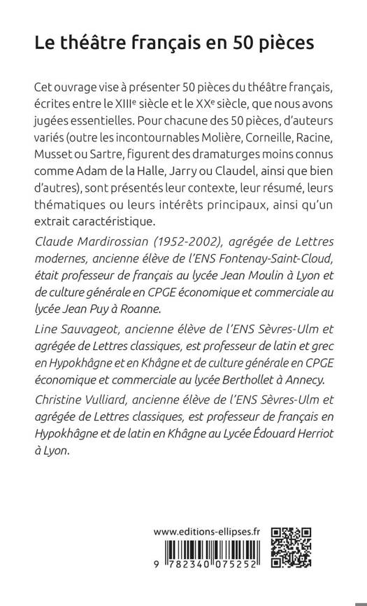 Cet ouvrage vise à présenter 50 pièces du théâtre français, écrites entre le XIIIe siècle et le XXe siècle, que nous avons jugées essentielles. Il s’adresse aussi bien à des lecteurs désireux de (re)découvrir des pièces-clefs de notre patrimoine littéraire qu’à des lycéens ou étudiants, à l’université ou en classes préparatoires économiques, scientifiques ou littéraires, soucieux d’améliorer leurs connaissances littéraires. Il peut aussi intéresser les candidats aux différents concours administratifs pour lesquels une bonne culture générale est requise.