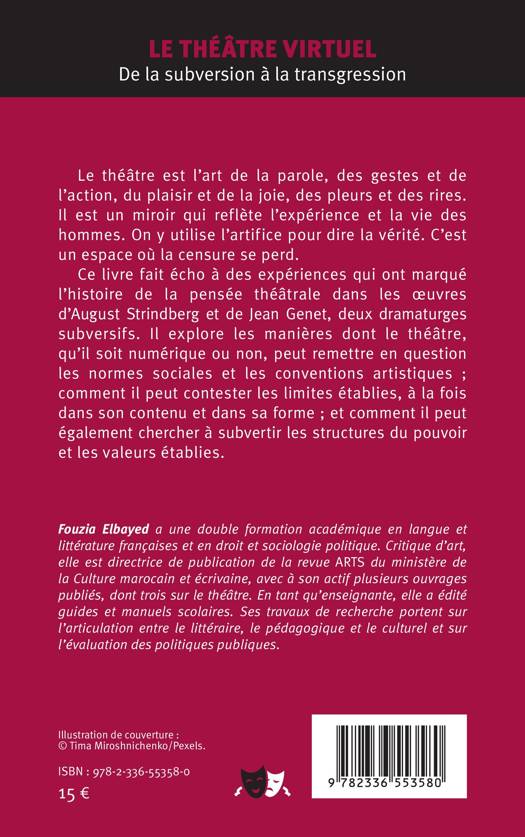 Le théâtre est l'art de la parole, des gestes et de l'action, du plaisir et de la joie, des pleurs et des rires. Il est un miroir qui reflète l'expérience et la vie des hommes. On y utilise l'artifice pour dire la vérité. C'est un espace où la censure se perd. Ce livre fait écho à des expériences qui ont marqué l'histoire de la pensée théâtrale dans les oeuvres d'August Strindberg et de Jean Genet, deux dramaturges subversifs. Il explore les manières dont le théâtre, qu'il soit numérique ou non, peut remettre en question les normes sociales et les conventions artistiques; comment il peut contester les limites établies, à la fois dans son contenu et dans sa forme; et comment il peut également chercher à subvertir les structures du pouvoir et les valeurs établies.