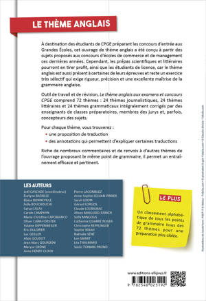 Outil de travail et de révision, Le thème anglais aux examens et concours CPGE comprend 72 thèmes : 24 thèmes journalistiques, 24 thèmes littéraires et 24 thèmes grammaticaux intégralement corrigés par des enseignants de classes préparatoires, membres des jurys et, parfois, concepteurs des sujets.