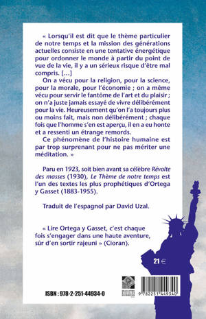 " Lorsqu'il est dit que le theme particulier de notre temps et la mission des generations actuelles consiste en une tentative energetique pour ordonner le monde a partir du point de vue de la vie, il y a un serieux risque d'etre mal compris. [] On a vecu pour la religion, pour la science, pour la morale, pour l'economie; on a meme vecu pour servir le fantome de l'art et du plaisir; on n'a juste jamais essaye de vivre deliberement pour la vie. Heureusement qu'on l'a toujours plus ou moins fait, mais non deliberement; chaque fois que l'homme s'en est apercu, il en a eu honte et a ressenti un etrange remords. Ce phenomene de l'histoire humaine est par trop surprenant pour ne pas meriter une meditation. " Paru en 1923, soit bien avant sa celebre Revolte des masses (1930), Le Theme de notre temps est l'un des textes les plus prophetiques d'Ortega y Gasset (1883-1955).