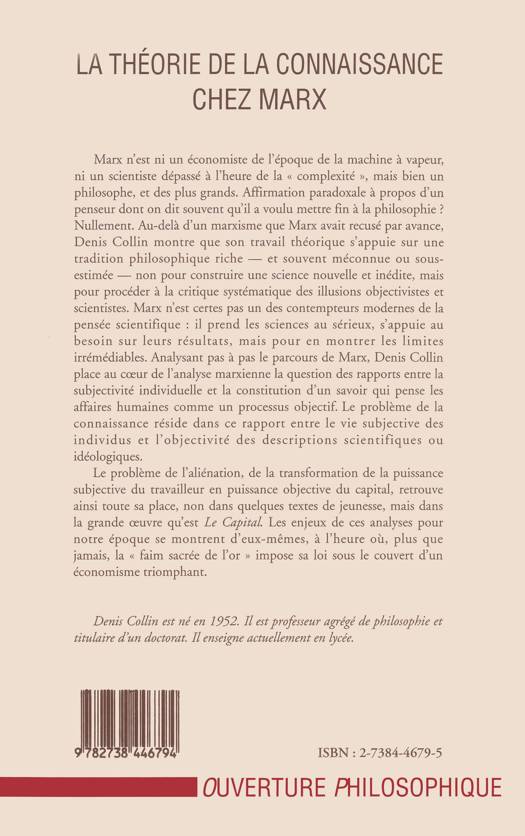Marx n'est ni un économiste de l'époque de la machine à vapeur, ni un scientiste dépassé à l'heure de la "complexité", mais bien un philosophe, et des plus grands. Affirmation paradoxale à propos d'un penseur dont on dit souvent qu'il a voulu mettre fin à la philosophie ? Nullement. Au-delà d'un marxisme que Marx avait recusé par avance, Denis Collin montre que son travail théorique s'appuie sur une tradition philosophique riche - et souvent méconnue ou sous-estimée - non pour construire une science nouvelle et inédite, mais pour procéder à la critique systématique des illusions objectivistes et scientistes. Marx n'est certes pas un des contempteurs modernes de la pensée scientifique : il prend les sciences au sérieux, s'appuie au besoin sur leurs résultats, mais pour en montrer les limites irrémédiables. Analysant pas à pas le parcours de Marx, Denis Collin place au coeur de l'analyse marxienne la question des rapports entre la subjectivité individuelle et la constitution d'un savoir qui pense les affaires humaines comme un processus objectif. Le problème de la connaissance réside dans ce rapport entre la vie subjective des individus et l'objectivité des descriptions scientifiques ou idéologiques. Le problème de l'aliénation, de la transformation de la puissance subjective du travailleur en puissance objective du capital, retrouve ainsi toute sa place, non dans quelques textes de jeunesse, mais dans la grande oeuvre qu'est Le Capital. Les enjeux de ces analyses pour notre époque se montrent d'eux-mêmes, à l'heure où, plus que jamais, la "faim sacrée de l'or" impose sa loi sous le couvert d'un économisme triomphant.