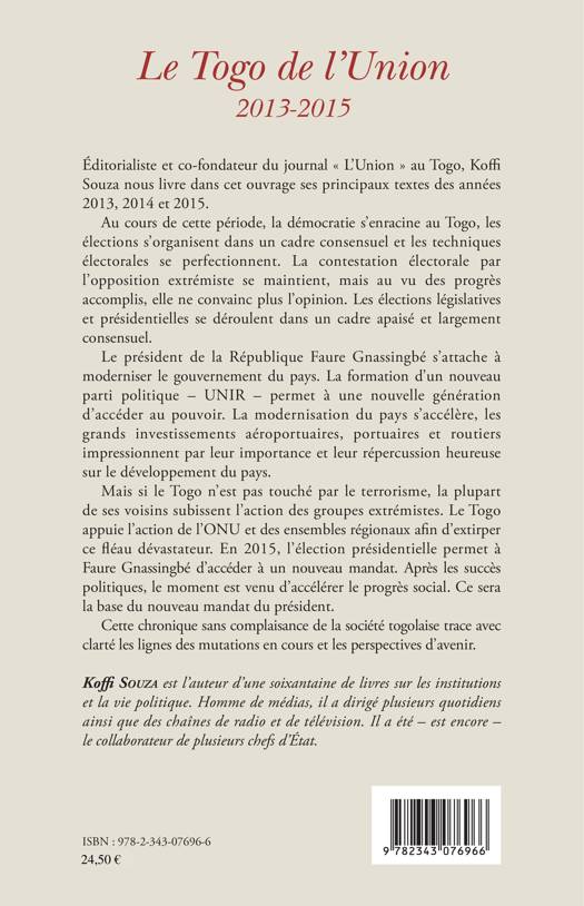 Editorialiste et co-fondateur du journal "L'Union" au Togo, l'auteur expose dans cet ouvrage ses principaux textes de 2013 à 2015 : au Togo, la démocratie s'enracine, les techniques électorales se perfectionnent et l'opposition extrémiste ne convainc plus l'opinion. C'est dans ce cadre politique apaisé et consensuel que le président Faure Gnassingbé accélère la modernisation du pays via ses investissements dans les transports et met l'accent sur le progrès social, tout en appuyant l'action de l'ONU dans sa lutte contre le terrorisme.