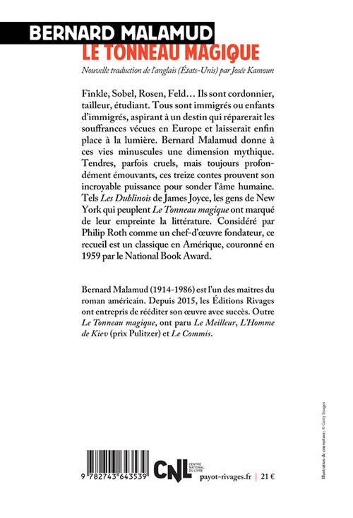 Finkle, Sobel, Rosen, Feld... Ils sont cordonnier, tailleur, étudiant. Tous sont immigrés ou enfants d'immigrés, aspirant à un destin qui réparerait les souffrances vécues en Europe et laisserait enfin place à la lumière. Bernard Malamud donne à ces vies minuscules une dimension mythique. Tendres, parfois cruels, mais toujours profondément émouvants, ces treize contes prouvent son incroyable puissance pour sonder l'âme humaine. Tels les «Dublinois »de James Joyce, les gens de New York qui peuplent «Le Tonneau magique »ont marqué de leur empreinte la littérature. Considéré par Philip Roth comme un chef-d'oeuvre fondateur, ce recueil est un classique en Amérique, couronné en 1959 par le National Book Award.