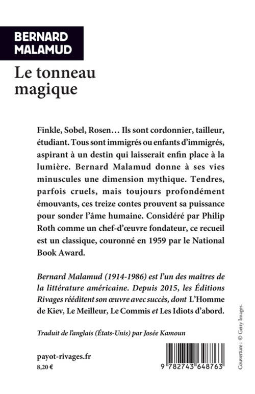 Bernard Malamud (1914-1986) est l'un des maîtres du roman américain. Depuis 2015, les Éditions Rivages ont entrepris de rééditer son oeuvre avec succès. Outre «Le Tonneau magique», ont paru «Le Meilleur»,« L'Homme de Kiev» (prix Pulitzer) et «Le Commis».