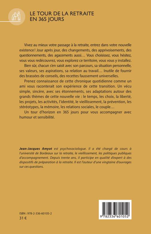 Vivez au mieux votre passage à la retraite, entrez dans votre nouvelle existence ! Jour après jour, des changements, des apprivoisements, des questionnements, des agacements aussi... Vous choisissez, vous hésitez, vous vous redécouvrez, vous explorez ce territoire, vous vous y installez. Bien sûr, chacun s'en saisit avec son parcours, sa situation personnelle, ses valeurs, ses aspirations, sa relation au travail... Inutile de fournir des brassées de conseils, des recettes faussement universelles. Prenez connaissance de cette chronique quotidienne comme un ami vous raconterait son expérience de cette transition. Un vécu simple, sincère, avec ses étonnements, ses adaptations autour des grands thèmes de cette nouvelle vie le temps, les choix, la liberté, les projets, les activités, l'identité, le vieillissement, la prévention, les stéréotypes, la mémoire, les relations sociales, le couple... Un tour d'horizon en 365 jours pour vous accompagner avec humour et sensibilité.