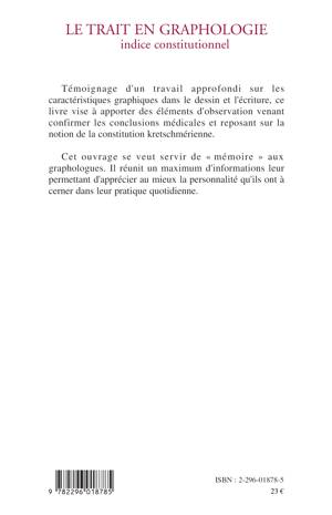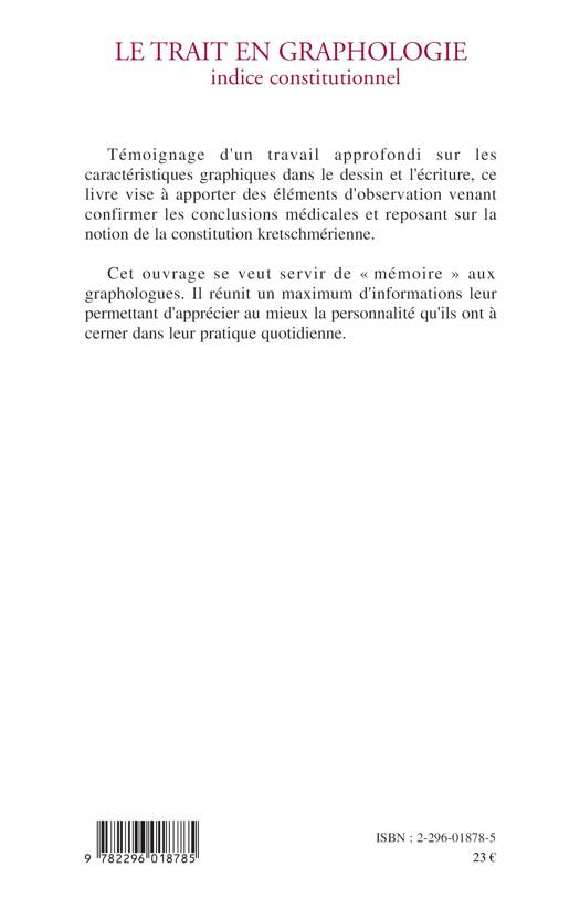 Témoignage d'un travail approfondi sur les caractéristiques graphiques dans le dessin et l'écriture, ce livre vise à apporter des éléments d'observation venant confirmer les conclusions médicales et reposant sur les notions de la constitution kretschmérienne. Cet ouvrage se veut servir de mémoire aux graphologues. Il réunit un maximum d'informations leur permettant d'apprécier au mieux la personnalité qu'ils ont à cerner dans leur pratique quotidienne.