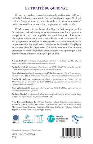 Cet ouvrage analyse la coopération transfrontalière entre la France et l'Italie à la lumière du traité du Quirinal, en vigueur depuis 2023, qui renforce l'intégration des territoires frontaliers en instaurant un comité dédié et en conférant de nouvelles compétences aux collectivités. L'étude se concentre sur la zone des Alpes du Sud, marquée par des flux intenses et des dynamiques locales soutenues par les programmes européens. À travers une approche pluridisciplinaire et collaborative, elle explore notamment le concept de bassin de vie transfrontalier, les groupements européens de coopération territoriale comme outils de gouvernance, les expériences menées et la nécessité d'impliquer les citoyens dans la construction d'un destin commun. Des annexes présentent les outils disponibles pour soutenir cette dynamique et les actions concrètes menées dans les Alpes du Sud.
