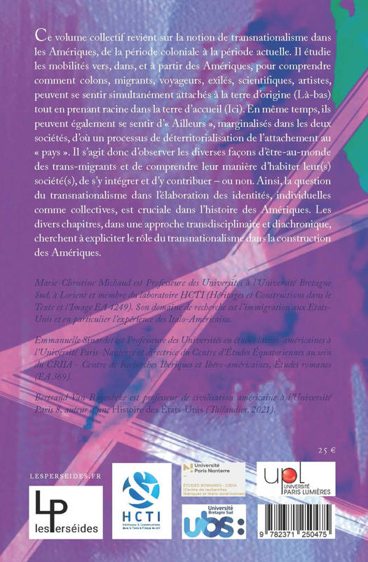 Cet ouvrage collectif revient sur la notion de transnationalisme dans les Amériques, de la période coloniale à la période actuelle. Il étudie les mobilités vers, dans, et à partir des Amériques, pour comprendre comment colons, migrants, voyageurs, exilés, scientifiques, artistes, peuvent se sentir simultanément attachés à la terre d’origine (Là-bas) tout en prenant racine dans la terre d’accueil (Ici). En même temps, ils peuvent également se sentir d’« Ailleurs », marginalisés dans les deux sociétés, d’où un processus de déterritorialisation de l’attachement au « pays ». Il s’agit donc d’observer les diverses façons d’être-au-monde des trans-migrants et de comprendre leur manière d’habiter leur(s) société(s), de s’y intégrer et d’y contribuer – ou non. Ainsi, la question du transnationalisme dans l’élaboration des identités, individuelles comme collectives, est cruciale dans l’histoire des Amériques. Les divers chapitres, dans une approche transdisciplinaire et diachronique, cherchent à expliciter le rôle du transnationalisme dans la construction des Amériques.