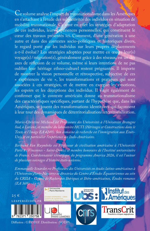 Cet ouvrage collectif, le second issu du projet Ici, là-bas, ailleurs, vise à expertiser l’impact du transnationalisme dans l’aire des Amériques selon une approche originale, celle de l’expérience subjective des acteurs et des agents du transnationalisme. Il s’agit de porter la focale sur le regard que les colons ou migrants portent sur eux-mêmes et sur leur expérience, afin de comprendre comment ces hommes et ces femmes ont vécu ces mouvements trans-impériaux, trans-coloniaux et trans-nationaux. Après avoir étudié des groupes de trans-migrants dans le premier volume du projet ILA, les auteurs de ce second volume se penchent sur leurs enfants et leurs petits- enfants, ceux qui sont souvent désignés comme la « deuxième » et la « troisième » génération, et peuvent également voir dans « le pays » une forme d’ancrage, des repères, des référents normatifs dont se nourrit leur identité.