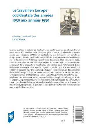 La crise sanitaire mondiale qui bouleverse en profondeur les mondes du travail nous incite à considérer avec d'autant plus d'intérêt la nouvelle question posée aux concours (CAPES et agrégation), qui interroge les mutations économiques, sociales, politiques, culturelles et environnementales entraînées par l'industrialisation de l'Europe occidentale des années 1830 aux années 1930. La désindustrialisation qui s'accélère depuis les années 1970 ne se réduit pas à un recul de la production industrielle. Elle signifie aussi l'effritement d'une civilisation industrielle ainsi que la disparition de la centralité du travail qui érigeait la question ouvrière en enjeu politique et social majeur. Ce dossier réunit des spécialistes qui présentent et commentent des sources de natures variées - correspondances, photographies, textes législatifs, pétitions, caricatures, etc. - produites tant en France qu'en Grande-Bretagne, Belgique, Allemagne, Italie et Espagne. Il permet d'éclairer les mutations de l'organisation du travail, leurs impacts sur les conditions de vie et de travail des mains-d'oeuvre artisanales et industrielles, et la place de la question sociale dans la constitution du mouvement ouvrier et des États sociaux.