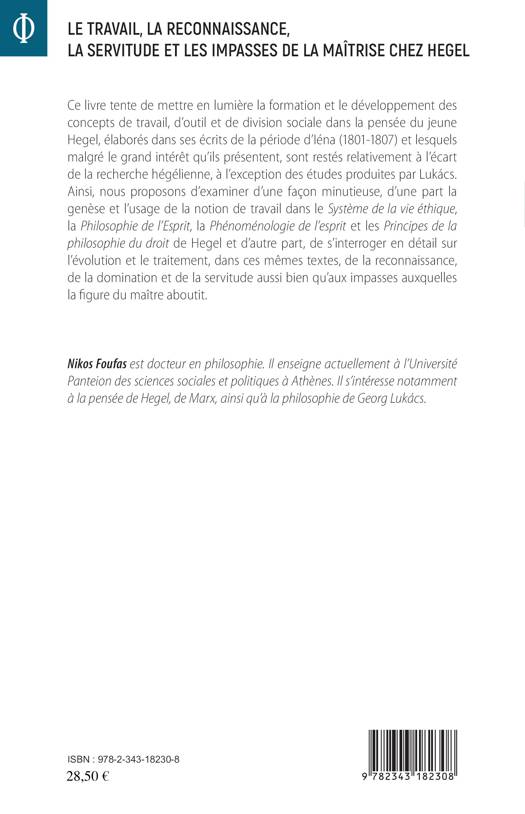 Ce livre tente de mettre en lumière la formation et le développement des concepts de travail, d'outil et de division sociale dans la pensée du jeune Hegel, élaborés dans ses écrits de la période d'Iéna (1801-1807) et restés relativement à l'écart de la recherche hégélienne. Ainsi, nous proposons d'examiner d'une façon minutieuse, d'une part la genèse et l'usage de la notion de travail et d'autre part, d'interroger en détail l'évolution et le traitement de la reconnaissance, de la domination et de la servitude aussi bien que les impasses auxquelles la figure du maître aboutit.