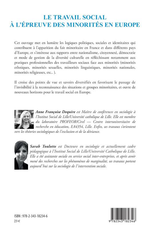 Cet ouvrage met en lumière les logiques politiques, sociales et identitaires qui contribuent à l'apparition du fait minoritaire en France et dans différents pays d'Europe. Il s'intéresse aux rapports entre nationalisme, citoyenneté, démocratie et mode de gestion de la diversité culturelle en réfléchissant notamment aux pratiques professionnelles des travailleurs sociaux face aux minorités. Il croise des points de vue et savoirs diversifiés en favorisant le passage de l'invisibilité à la reconnaissance des situations en groupes minoritaires et ouvre de nouveaux horizons pour le travail social en Europe.