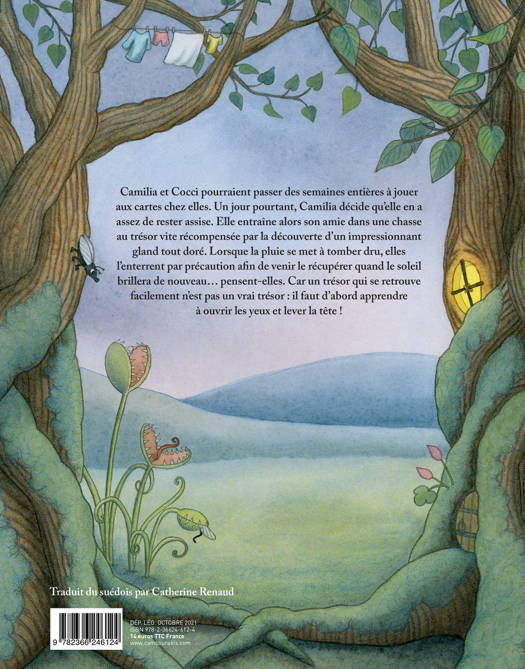 Camilia et Cocci pourraient passer des semaines entières à jouer aux cartes chez elles. Un jour pourtant, Camilia décide qu'elle en a assez de rester assise. Elle entraîne alors son amie dans une chasse au trésor vite récompensée par la découverte d'un impressionnant gland tout doré. Lorsque la pluie se met à tomber dru, elles l'enterrent par précaution afin de venir le récupérer quand le soleil brillera de nouveau... pensent-elles. Car un trésor qui se retrouve facilement n'est pas un vrai trésor : il faut d'abord apprendre à ouvrir les yeux et lever la tête !