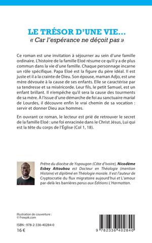 Ce roman est une invitation à séjourner au sein d’une famille ordinaire. L’histoire de la famille Eloé résume ce qu’il y a de plus commun dans la vie d’une famille. Chaque personnage incarne un rôle spécifique. Papa Eloé est la figure du père idéal. Il est juste et il a la crainte de Dieu. Son épouse, maman Adjo, est une mère dévouée à la cause de ses enfants. Elle se caractérise par sa tendresse et sa miséricorde. Leur fils, le petit Samuel, est un enfant brillant. Il n’empêche qu’il sera la cause des tourments de sa mère. À l’issue d’une démarche de foi au sanctuaire marial de Lourdes, il découvre enfin le vrai chemin de sa vocation : servir et donner Dieu aux hommes.