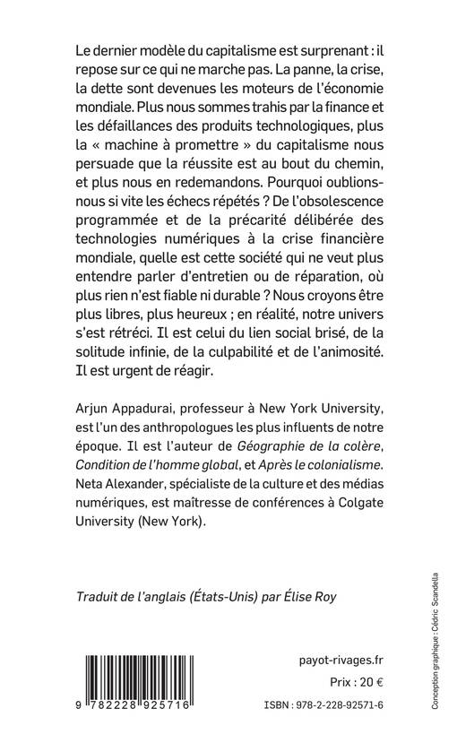 Le dernier modèle du capitalisme est surprenant : il repose sur ce qui ne marche pas. La panne, la crise, la dette sont devenues les moteurs de l'économie mondiale. Plus nous sommes trahis par la finance et les défaillances des produits technologiques, plus la "machine à promettre" du capitalisme nous persuade que la réussite est au bout du chemin, et plus nous en redemandons. Pourquoi oublions-nous si vite les échecs répétés ? De l'obsolescence programmée et de la précarité délibérée des technologies numériques à la crise financière mondiale, quelle est cette société qui ne veut plus entendre parler d'entretien ou de réparation, où plus rien n'est fiable ni durable ? Nous croyons être plus libres, plus heureux ; en réalité, notre univers s'est rétréci. Il est celui du lien social brisé, de la solitude infinie, de la culpabilité et de l'animosité. Il est urgent de réagir.