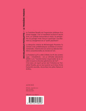 Artiste humaniste, Michelangelo Pistoletto, est mondialement connu pour une oeuvre en constante évolution. La fondation qu'il a créé - Citadellarte - est un véritable laboratoire formé d'experts et de chercheurs dans les différents secteurs du tissu social. Elle est destinée à replacer l'art au coeur de la fabrique sociale, et à dessiner une géographie de la transformation opérative de dimension glocale. C'est de cet engagement qu'est née l'initiative du Troisième Paradis.