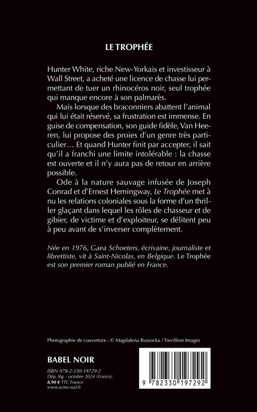 Hunter White, riche New-Yorkais et investisseur à Wall Street, a acheté une licence de chasse lui permettant de tuer un rhinocéros noir, seul trophée qui manque encore à son palmarès. Mais lorsque des braconniers abattent l'animal qui lui était réservé, sa frustration est immense. En guise de compensation, son guide fidèle, Van Heeren, lui propose des proies d'un genre très particulier... Et quand Hunter finit par accepter, il sait qu'il a franchi une limite intolérable : la chasse est ouverte et il n'y aura pas de retour en arrière possible. Ode à la nature sauvage infusée de Joseph Conrad et d'Ernest Hemingway, "Le Trophée" met à nu les relations coloniales sous la forme d'un thriller glaçant dans lequel les rôles de chasseur et de gibier, de victime et d'exploiteur, se délitent peu à peu avant de s'inverser complètement.