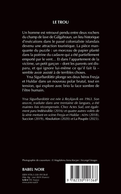 Un homme est retrouvé pendu entre deux rochers du champ de lave de Gálgahraun, un lieu historique d'exécutions dans le passé colonialiste islandais devenu une attraction touristique. La pièce manquante du puzzle : un morceau de papier planté dans la poitrine du cadavre qui a été partiellement emporté par le vent... Et dans l'appartement de la victime, un petit garçon - dont les parents ont disparu, et qui ignore lui-même ce qu'il fait là - semble avoir assisté à de terribles choses. Yrsa Sigurðardóttir plonge ses deux héros Freyja et Huldar dans un nouveau polar brutal, tout en tension, qui explore avec brio la face sombre de l'être humain.