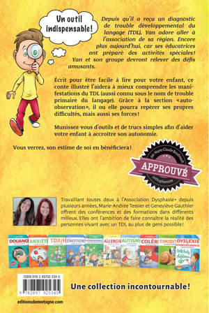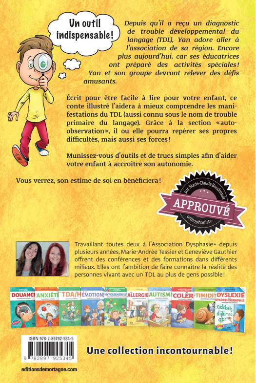 Depuis qu'il a reçu un diagnostic de trouble développemental du langage (TDL), Yan adore aller à l'association de sa région. Encore plus aujourd'hui, car ses éducatrices ont préparé des activités spéciales ! Yan et son groupe devront relever des défis amusants. Écrit pour être facile à lire pour votre enfant, ce conte illustré pour les 7 ans et + l'aidera à mieux comprendre les manifestations du TDL (aussi connu sous le nom de trouble primaire du langage ou dysphasie). Grâce à la section « auto-observation », il ou elle pourra repérer ses propres difficultés, mais aussi ses forces ! Munissez-vous d'outils et de trucs simples afin d'aider votre enfant à accroître son autonomie. Vous verrez, son estime de soi en bénéficiera !