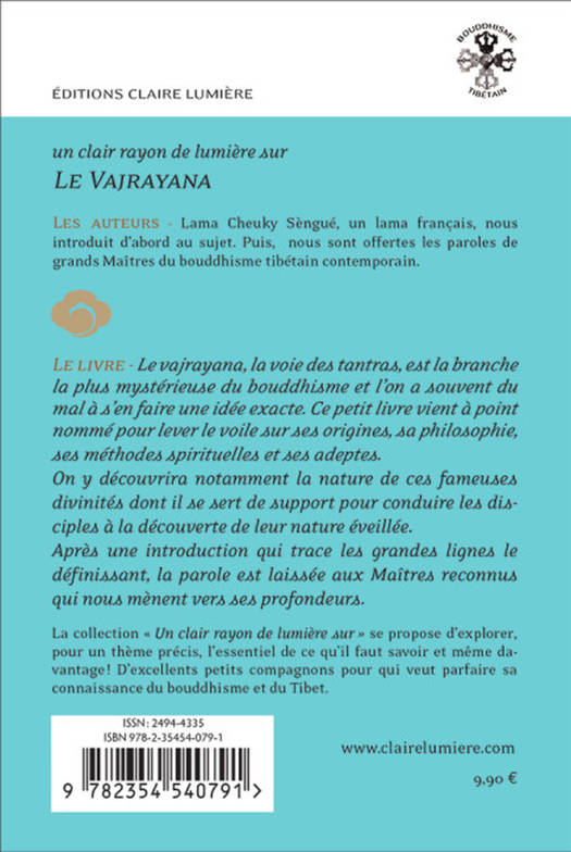 Le Vajrayana, la voie des tantras, est la branche la plus mystérieuse du bouddhisme et l’on a souvent du mal à s’en faire une idée exacte. Ce petit livre vient à point nommé pour lever le voile sur ses origines, sa philosophie, ses méthodes spirituelles et ses adeptes. On y découvrira notamment la nature de ces fameuses divinités dont il se sert de support pour conduire les disciples à la découverte de leur nature éveillée. Après une introduction qui trace les grandes lignes définissant le Vajrayana, la parole est laissée aux Maîtres reconnus qui nous mènent vers ses profondeurs.