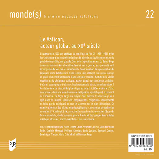 L’ouverture en 2020 des archives du pontificat de Pie XII (1939-1958) invite les chercheurs à reprendre l’étude de cette période particulièrement riche du point de vue de l'histoire globale. Quel a été le positionnement du Saint-Siège dans un système international bouleversé par la guerre, puis profondément recomposé à la fois par les débuts de la décolonisation, la bipolarisation de la Guerre froide, l’élaboration d’une Europe unie à l’Ouest, mais aussi la mise en place d’un multilatéralisme d’une ampleur inédite ? Comment la vieille machine de la diplomatie vaticane, acteur global par excellence, anticipe-t-elle et accompagne-t-elle ces bouleversements et ces reconfigurations ?