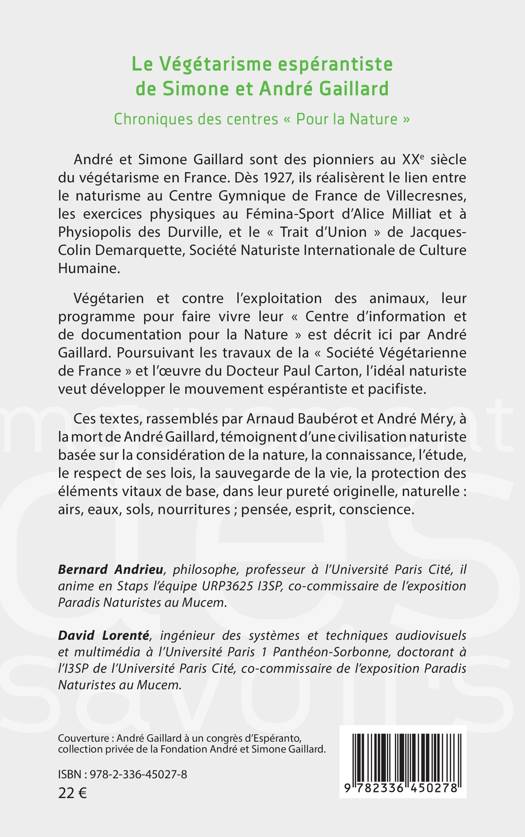 André et Simone Gaillard sont des pionniers au XXe siècle du végétarisme en France. Dès 1927, ils réalisèrent le lien entre le naturisme au Centre Gymnique de France de Villecresnes, les exercices physiques au Fémina-Sport d'Alice Milliat et à Physiopolis des Durville, et le Trait d'Union de Jacques-Colin Demarquette, Société Naturiste Internationale de Culture Humaine. Végétarien et contre l'exploitation des animaux, leur programme pour faire vivre leur Centre d'information et de documentation pour la Nature est décrit ici par André Gaillard. Poursuivant les travaux de la Société Végétarienne de France et l'oeuvre du Docteur Paul Carton, l'idéal naturiste veut développer le mouvement espérantiste et pacifiste. Ces textes, rassemblés par Arnaud Baubérot et André Méry, à la mort de André Gaillard, témoignent d'une civilisation naturiste basée sur la considération de la nature, la connaissance, l'étude, le respect de ses lois, la sauvegarde de la vie, la protection des éléments vitaux de base, dans leur pureté originelle, naturelle: airs, eaux, sols, nourritures; pensée, esprit, conscience.